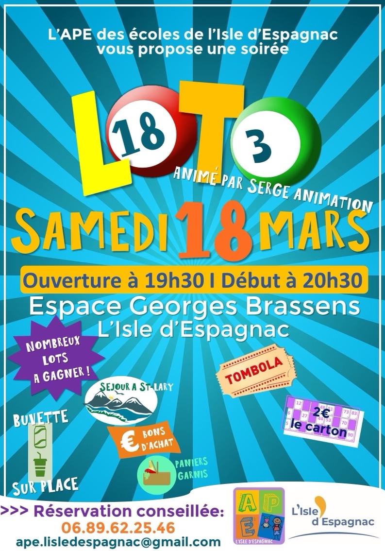 L’APE des écoles de L’Isle d’Espagnac vous propose une soirée Loto le samedi 18 mars 2023. L’intégralité des bénéfices sera reversée aux écoles de L’Isle d’Espagnac. Il est conseillé de réserver les tables au 06.89.62.25.46.